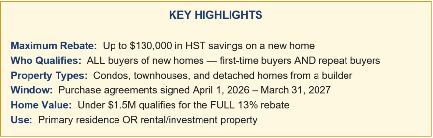 The rebate applies ONLY to purchase agreements signed within the April 1, 2026 to March 31, 2027 window. Agreements signed before April 1, 2026 or after March 31, 2027 do NOT qualify for the expanded rebate — they fall under the previous rules. If you are currently in negotiations with a builder, the date on your APS is critical. |