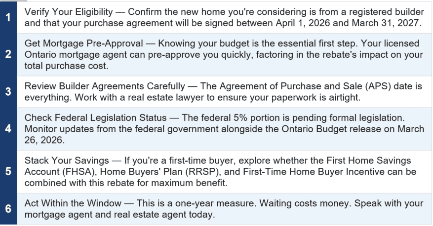 This article is intended for informational purposes only and does not constitute financial, legal, or tax advice. The HST rebate details described reflect the announcement made by Premier Doug Ford on March 25, 2026, and are subject to formal legislation through the 2026 Ontario Budget and corresponding federal legislation. Readers should verify all eligibility details at ontario.ca and consult a licensed mortgage agent, real estate lawyer, or tax professional before making any home purchase decisions.